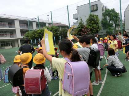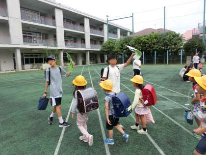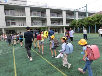すべての班の安全が確認でき、集団下校が始まりました。6年生班長が下学年を見守りながら下校しています。後ろを振り向きながら歩く速さを考えているようです。「2列になって歩こうね」「間をあけると危ないよ」とやさしく声もかけていました。最上級生としての6年生の責任と思いやりある行動で、初めての集団下校訓練が立派にできました。