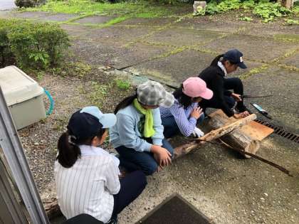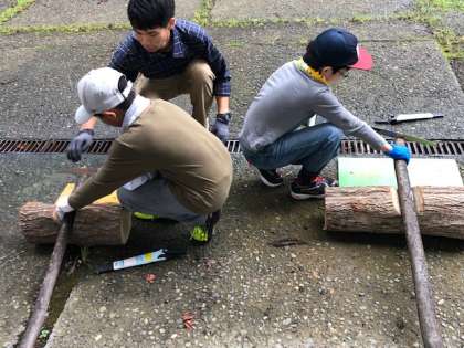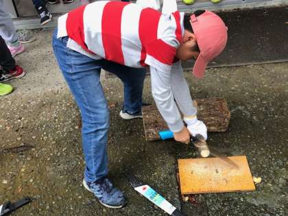 午後1時からは里山体験です。丸太切りに挑戦している子どもたちの様子です。一生懸命にノコギリを使って木を切っています。