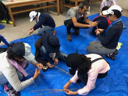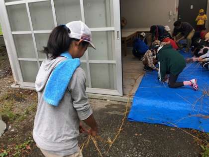 どんどん上達する子どもたち。職人さんのようです。わら縄も長くつなげることができました。