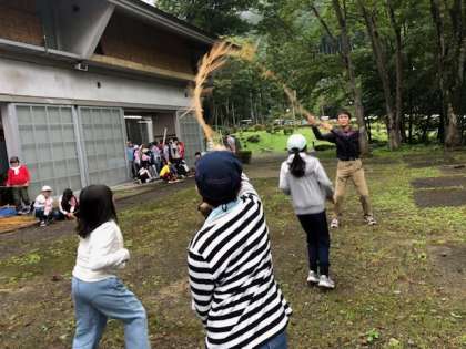 縄跳びができるくらい長いわら縄ができました。楽しく遊びました。笑顔がいっぱいです。