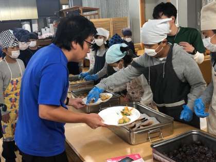 食事係が食事の準備に取りかかりました。朝早くから補助員さんがお茶とご飯とお吸い物の準備をしてくださっていました。配膳についてもていねいに教えてくださいました。