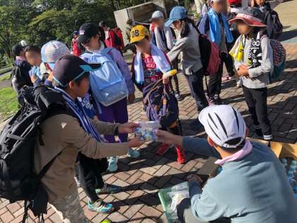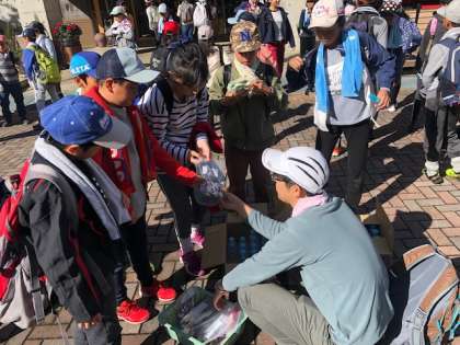 さあ、いよいよ2日目のメインの行程、ハイキングに出かけます。本来でしたら、鉱石山登山の予定でしたが、スズメバチの目撃情報がありました。駆除は終わっているとのことですが、子どもたちの安全を第一に考え、21世紀の森ハイキングコースを歩く行程に変更しました。でも、豊かな自然を楽しむことはできます。出発前に、先生からアメと水を受け取りました。