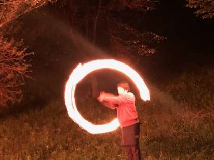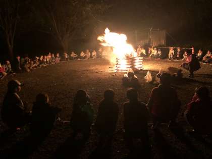 夕食後、川場村に星が瞬きはじめたころ、キャンプファイヤーがスタートしました。レク係が大活躍しました。最初に火の子たちが4つの火を灯しました。静かな歌声の中、火の勢いが増してきました。補助員さんがトーチトワリングを披露してくださいました。驚きの歓声とともに大きな拍手がおくられましら。
