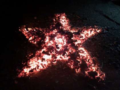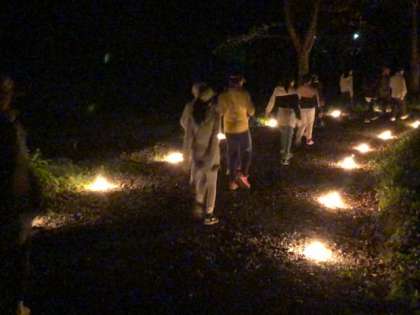 キャンプファイヤーも終わろうとする中、あたたかな光が浮かび上がりました。子どもたちのために補助員さんたちが、演出してくださったのです。静かに星の火を見つめる子どもたち。すてきな思い出がまた一つ増えました。やさしい光の中、子どもたちは宿舎に戻りました。