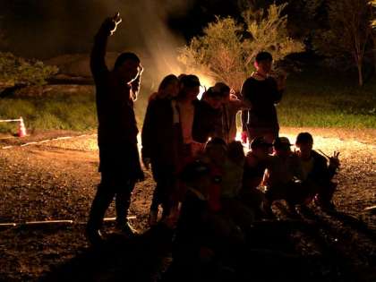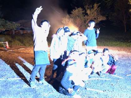 キャンプファイヤーで準備と進行をしたのがレク係の子どもたちです。みんなで楽しむことができました。最後に記念撮影、大きなポーズで満足感を表しました。
