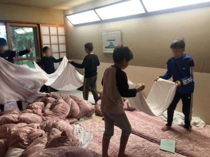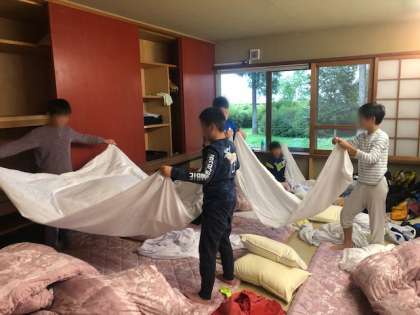 川場移動教室3日目の朝を迎えました。3日目の朝はやることがたくさんあります。起床から30分の間にシーツや枕カバーをたたみました。友達と協力してがんばっています。