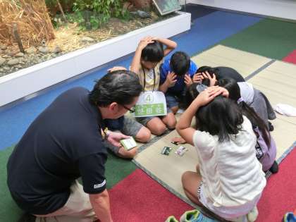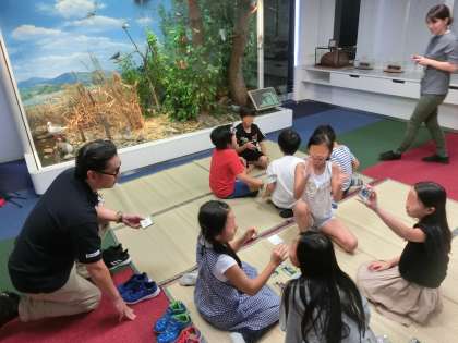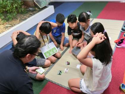 「英語で学ぶ世田谷コーナー」の様子です。このコーナーでは、英語版の「世田谷カルタ」などを楽しみながら、世田谷区の自然や生き物や歴史への理解を深めることができました。子どもたちはこの「世田谷カルタ」を、教科「日本語」で学習しています。これまでの学習や世田谷区の様子を思い描きながら、楽しくゲームに参加していました。