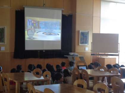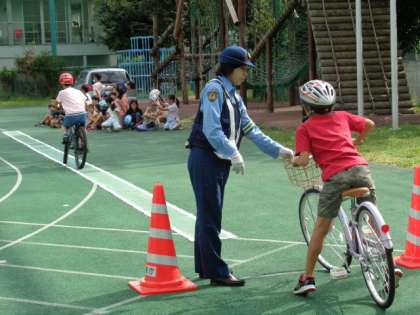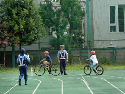 世田谷警察署の方々の説明を聞いた後、実際に自転車に乗りコースを走りました。自転車は車道を走るので、出発するときの安全確認は「右見て、左見て、右見て、右後ろ見て」だと教えていただきました。また、ランチルームではDVDをみて学習しました。