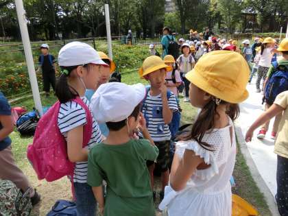 お弁当の後は、グループで遊びました。2年生がリーダーシップを発揮し、みんなで遊びの相談をしていました。鬼ごっこをしたり、だるまさんがころんだを楽しんだりと、存分に楽しいひとときを送りました。とても上手にグループ行動ができた1・2年生。2年生の頼もしさを感じました。1年生も友達と仲よく楽しく行動でき、成長を感じる遠足になりました。青空の下、心地よい疲れを感じながら学校に戻りました。