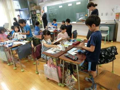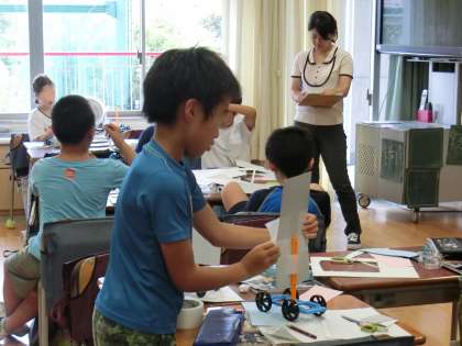 自分の予想をもとに、車の帆を工作用紙で作成しました。形や大きさ、折り曲げ方など、子どもたち一人一人の「予想」を大切にしました。