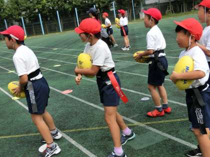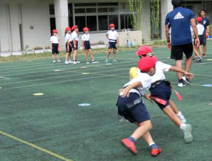 授業の後半はゲームを行いました。ルールを教えていただき、攻める側と守る側を体験しました。これまで教えていただいた動きを上手に使い、機敏に体を動かす子どもたち。すばらしい動きです。応援にも熱が入りました。