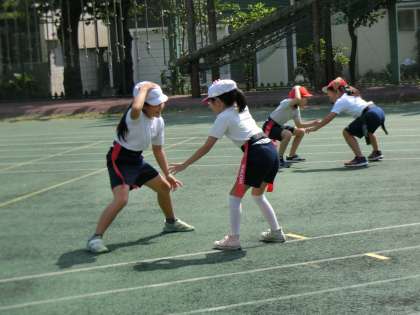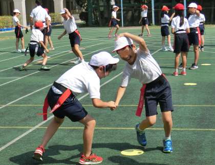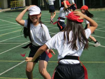 頭に手をのせ、合図とともに相手のタグをとります。みんな真剣です。でもとっても楽しそうです。