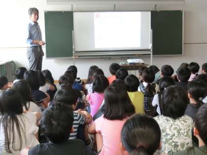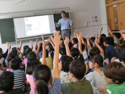 10月3日、日本体育大学教授 野井真吾先生をお招きして、4年生の子どもたちに授業をしていただきました。今日の授業は「元気大作戦!」です。野井先生の楽しいお話に子どもたちは引き込まれます。多くのことを教えていただきました。「一つ一つの生活習慣(運動・休養・栄養)はどれも関連し合っています。実際よく遊んだ日、おなかは・・・? いっぱい食べたらねむけは・・・? つながっているのです。今日は、みんなの元気を支える睡眠に関する元気大作戦のお話です。」と、ゲームやスライドを使って、たのし〜いお話を組み立てていただきました。先生のお話に背筋をぴんと伸ばして聞くことのできる4年生の「元気」をたくさんほめていただきました。