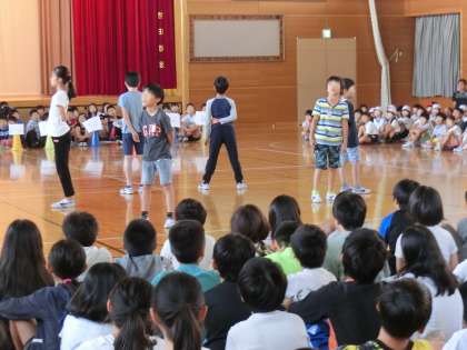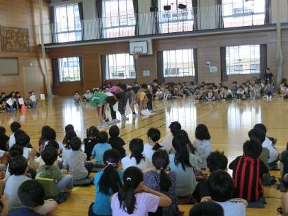 10月10日、子どもまつり紹介集会を行いました。これまで子どもたちは、学級で話し合いをたくさん重ねながら子どもまつりの準備に取り組んできました。意欲的に、前向きにがんばる子どもたち。毎朝、学級で使う材料を持って来たり、学級で制作活動を続けたり、子どもたちはいつも楽しそうです。わくわく、どきどきするような時間をたくさん重ねてきました。今日は、各学級の出し物を全校に紹介する日です。少し緊張しながらも豊かな表現力で、学級の出し物を精一杯に紹介していました。