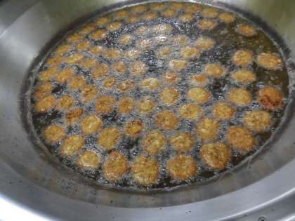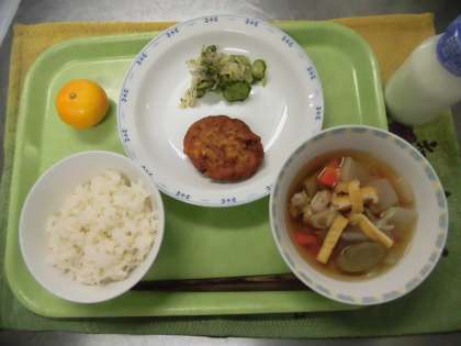 今日は宮崎県の郷土料理『飫肥天』を給食室で手作りしました。飫肥天の作り方は、豆腐、魚のすり身をすりつぶすようにまぜ、その中に卵、しょうが、黒砂糖、ざらめ、塩、味噌を入れてさらによくぜます。一人分ずつ形を整えてから低温の油でじっくり揚げます。今日の魚のすり身は、東京都八丈島のものを使用しましたので、地産地消にもなる献立でした。味は淡泊ですが、少し甘めの薩摩揚げといった感じでよく食べていました。