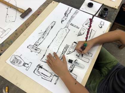 3年生が現在取り組んでいるのは「図工室の道具図鑑」です。授業のめあては、“よく見て描くこと”、“道具の使い方を想像しながら描くこと”です。道具にはその形でなければならない理由があります。ある機能を果たすために、一切の無駄を省いた必然の形。道具の形のふしぎ、おもしろさを3年生なりに“よく見て”、“想像して”描いてほしいなとおもっています。(図工専科)