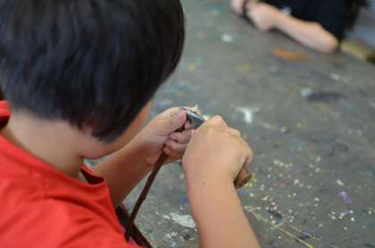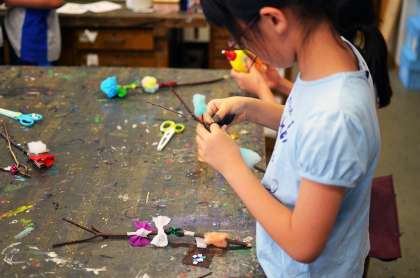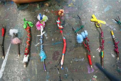 3年生、「図工室の道具図鑑」のつづき。子どもたちが使っているペンは、木の枝を削ってつくったものです。小刀で木の枝を削り、身の回りの材料で飾りつけをしました。「描くための道具をつくること」もこの授業で大切にしている経験です。(図工専科)