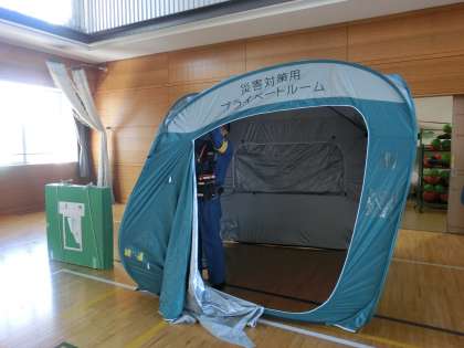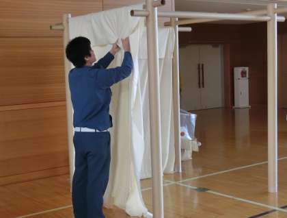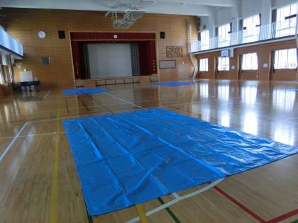 防災訓練に引き続き、避難所設営訓練を行いました。災害時には駒沢小学校が避難所として開設されます。いざというときに避難所をスムーズに運営していくための訓練を地域の皆様、町会の皆様が中心となって毎年実施しています。避難所担当の方々は、体育館に敷くブルーシートを確認したり、プライベートルームや簡易間仕切りの設置訓練を行いました。この体育館が主な避難場所となります。