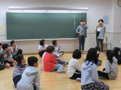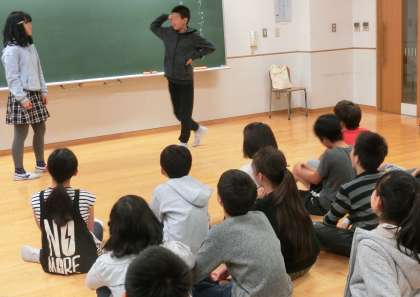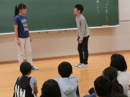 後半は「対話劇」を行いました。この日のお題は「約束の時間に間に合わなかった友達同士」です。子どもたちはいろいろなシチュエーションを自分たちで考え、その様子を豊かに表現できるよう、ペアの友達と話し合いました。表現の方法をたくさん練習しました。発表の時間になると積極的に手をあげ、みんなの前で演じました。友達の表現方法をよく見て、自分の表現方法を見直したり変えたりすることを目指した活動です。意欲的に表現し、しっかり友達の表現を見守る子どもたち。生き生きとした活動になりました。