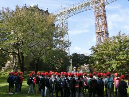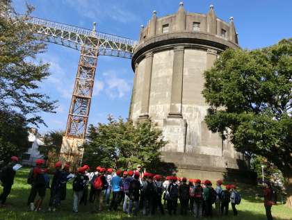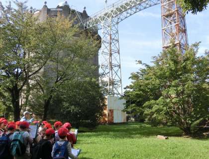 駒沢給水塔を間近に見学しました。歴史あるこの駒沢給水塔。関東大震災、戦争を経て、建物の形を変えたり、計画が変更になったりしたそうです。96年の時間を経てもこうして、この駒沢の地に給水塔があることの意味を教えていただきました。高さ30メートル、直径17メートルもの大きさの給水塔。高さの3分の1まで水が貯められているそうです。災害に備えての対応と聞きました。子どもたちも給水塔の歴史について聞き入っていました。