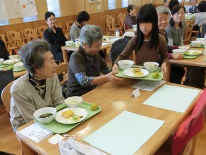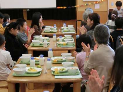参加していただいた皆様におもてなしの心を込めて、給食を運ぶ子どもたち。ていねいにていねいに運んでいました。