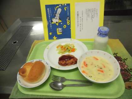 今日の献立は、読書の秋にちなんで本の中に出てくる料理から選んだ献立です。本のタイトルは『パンダのポンポン 夜空のスターチャウダー』という本です。司書の先生が選んでくれました。中学年向きの本でしたので、給食時間に中学年の子どもたちに紹介してみました。読んだことがあるよという子は何人かいました。いつものクラムチャウダーにアルファベットマカロニを入れてみましたが、たくさん入っていたのですが、小さいサイズでしたので、すぐに気づいた子もいれば、気づかずに食べ終えてしまった子もいたようです。