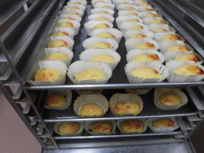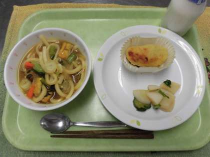 今日は子供たちから人気のメニューでした。カレーうどんのつゆは、少し辛いと言っていた1年生が何人かいましたが、どの学年もとてもよく食べていました。スイートポテトは秋を代表するさつまいもを使ったお菓子です。作り方は、さつまいもの皮をむいて、蒸してからつぶし、さとうや塩、生クリーム、バターなどをよく混ぜ合わせ、形を整えます。卵液を塗ってからオーブンで焼きますが、焼き色がつくとおいしそうに見えますので、ご家庭では、卵黄のみと少しのみりんを足して焼いてもいいですね。今日は数人の子供たちがレシピをもらいに来てくれました。