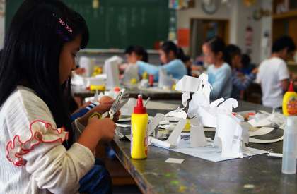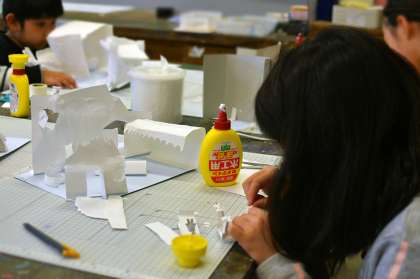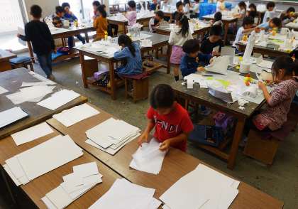 「とても不思議な世界なので、できるだけ自由に発想をしてほしい」という担任の要望から、常識にとらわれないで、手を動かしながら感覚的につくれるようにと、さまざまな白い紙を用意することにしました。学校ですぐ手に入る板目紙、ボール紙、画用紙、コピー用紙、和紙、ツヤ紙、書道用の半紙、トレーシングペーパー、お花紙の9種類。厚いものから薄いもの、透けるもの、ツヤのあるものまで異なる質感の紙を用意しました。つくるときの約束は、いつもの「材料をそのまま使わない」ということだけです。