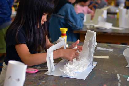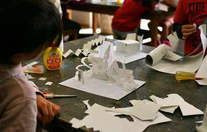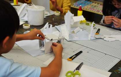 3年生、学習発表会の舞台美術を考える授業のつづき2。(図工専科)