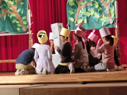 11月28日、学習発表会のリハーサルを行いました。リハーサルでは、子どもたちの最後の練習が行われました。どの学年も自分たちで創り上げてきた素晴らしい舞台です。先日チラシを各ご家庭に配布させていただいたとおり、今年度は体育館が「駒沢スマイル劇場」となり、子どもたちの活躍が繰り広げられます。この「駒沢スマイル劇場」で6つの物語が上演されます。