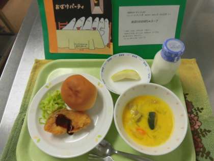 今日はコラボ給食第3弾「おばけのパーティー」より、その本の中に登場する「おばけのかぼちゃスープ」を取り入れました。かぼちゃは、夏から秋が収穫の時期で、長時間保存がききます。今日のようにスープにしたり、煮物にしたり、お菓子の材料にしたりとさまざまな料理に使われます。学習発表会の児童鑑賞日のため、少し遅れての給食時間でしたが、子どもたちはしっかり食べていました。