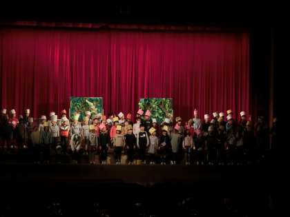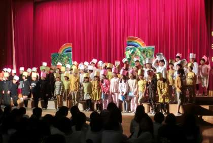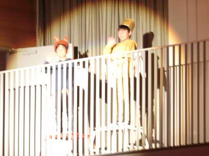 2年生は国語の時間に学習した「きつねのおきゃくさま」を演じました。国語の学習ではきつねの気持ちを中心に考えを深めてきました。「きつねのおきゃくさま」のその後の物語を考える学習もしました。子どもたちは、国語での学びを劇の世界に結び付けました。語りと演技で表現する2年生の物語、みんなでがんばって物語の世界をつくりました。小道具も子どもたちが一生懸命に作りました。かわいらしい動物になりきって演じた2年生。がんばりました。