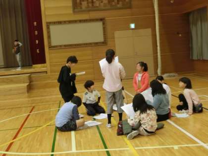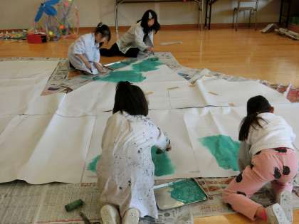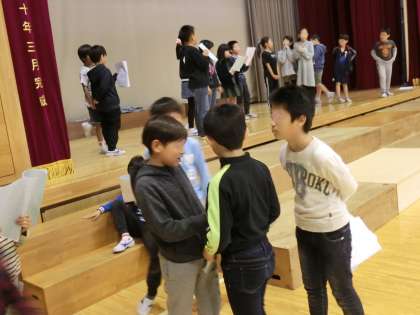 3年生の練習の様子です。最初のころは場面ごとに練習を重ねました。表現の工夫や心をこめたせりふ、動作などについて、みんなでよく話し合いました。世界を創り上げていったのは子どもたちです。「ジェラルドの素晴らしい世界」とはどんなイメージなのか、図工の時間に、一人一人が考えました。自分たちでアイディアを出し合い、舞台をみんなで完成させていったのです。3枚目の写真は、大きな背景を一生懸命に作っている3年生の子どもたちです。