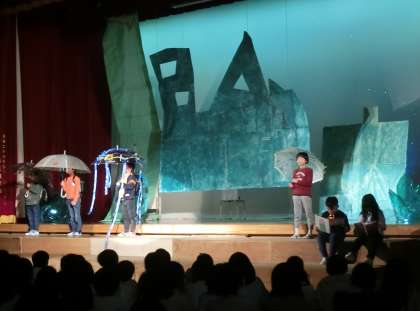 子どもたちが創り上げた「ジェラルドの素晴らしい世界」です。ジェラルドは魔法使い、どんなものでも作り出すことができます。彼が作り出した世界はどんな風景なのか、そこにはどんな人たちが住んでいて、何が起こるのか。すべて3年生が考え、形にしました。