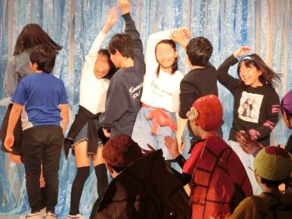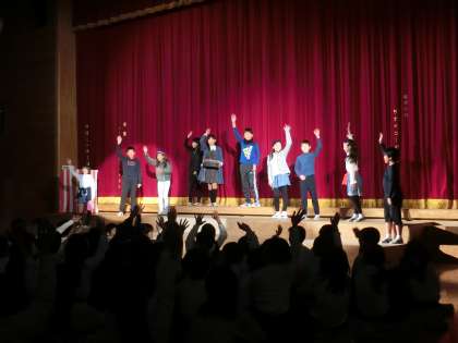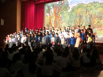 5年生の「かめと友情の旅」の世界です。川場移動教室のキャンプファイヤーの出し物のオクラホマミキサーも取り入れました。思い出の出し物です。玉手箱を開けるかどうかの多数決、児童鑑賞日は、鑑賞している子どもたちも、思わず多数決に参加しました。