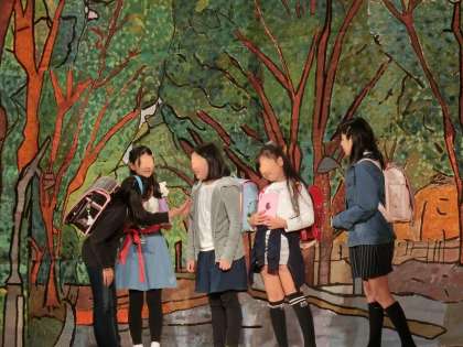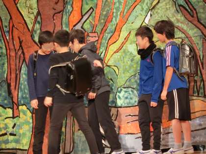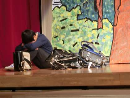 5年生の「かめと友情の旅」の世界です。登場する子どもたちを変えたのは、いつもの帰り道で出会った「かめ」たち。かめに連れられ、その先に待っていたのは・・・・。海の世界で子どもたちは大切なものに気づきます。笑いあり、涙あり、英語あり、ダンスあり・・・5年生が創り上げた「物語」がはじまりました。
