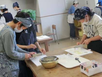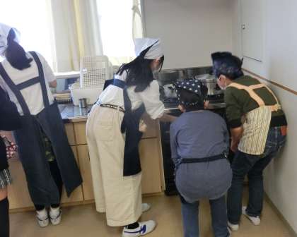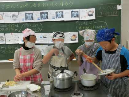 5年生の家庭科の時間の様子です。今日は調理実習。みそ汁づくりに挑戦していました。グループでよく話し合って手際よく進めていました。身支度もしっかり整えていました。みんなとても生き生きしています。調理実習を楽しんでいる様子が伝わってきました。