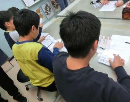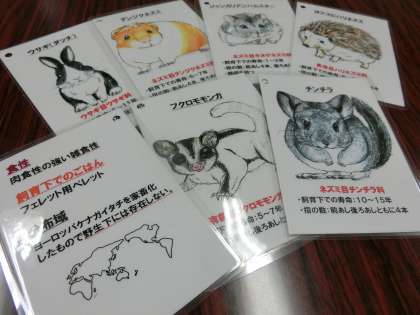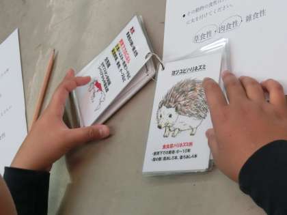 授業の終わりに、振り返りを行いました。国際動物専門学校の学生の皆さんから、5年生の子どもたち一人一人にプレゼントをいただきました。この日、観察したり、ふれ合ったり、餌をあげたりした動物たちのカードです。それぞれの動物たちの食性や特徴の説明が簡潔に表されています。動物たちのイラストは、国際動物専門学校の学生の皆さんが描いた手作りです。あたたかい心のこもったプレゼントにみんな大喜びでした。
