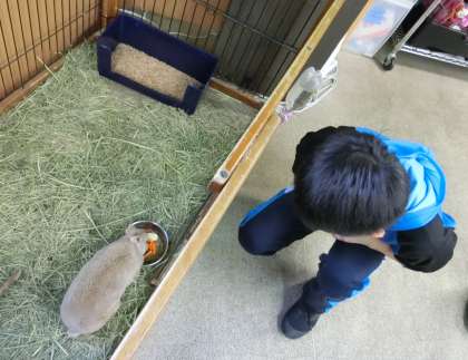 動物の食性に応じて、子どもたちが計量したり、野菜をちぎったりしながら作った餌を与える子どもたち。「食べてくれるかなあ」「この分量でだいじょうぶかなあ」「私が担当した動物は餌をふやかしたんだよ」など、わくわくどきどきしながら、動物たちに餌をあげました。動物たちが餌を食べはじめると、5年生の子どもたちはほっとした様子です。中には、夜行性の動物も巣から出てきて、餌を食べてくれました。時間を忘れるくらい、その様子を見つめていました。