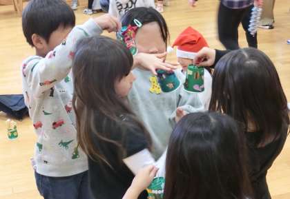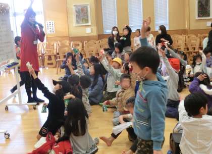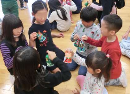 ベルができあがると、子どもたちは、互いにできたベルを見せ合っていました。どの子もととっても上手にできました。このベルを使って「ジングルベル」の歌を歌いました。子どもたちのベルからかわいらしい鈴の音が響きました。
