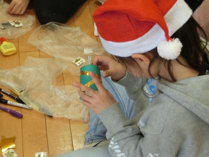 サンタさんとトナカイさんからの楽しいゲームが終わると、次はクリスマスのベルづくりです。サンタベルとクリスマスツリーベルのどちらか好きなほうを選んで作りました。熱心にベルづくりに取り組む子がたくさんいました。