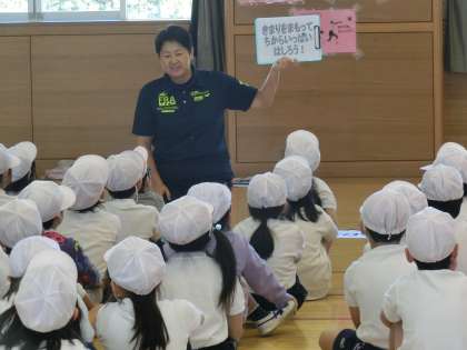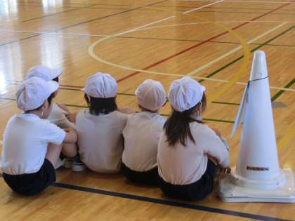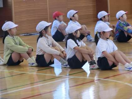 「じゃんけんすごろく」を1周終えると、グループの仲間同士声をかけ合って体育ずわり。先生の集合の合図で体育ずわり。リレー遊びでは全員が終わると体育ずわり。子どもたちのきびきびした動きが光っていました。