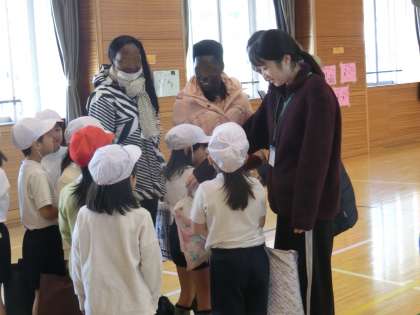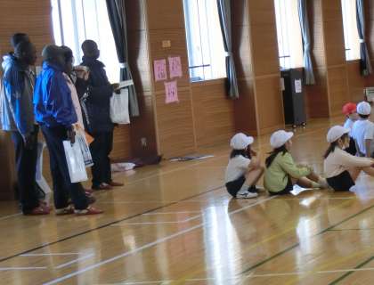 1年生の体育の授業を紹介します。この日は、はるばるウガンダから小学校の先生をお迎えしました。ウガンダの小学校の授業の充実を目指している先生方が研修のため日本に来日されたのです。日本の体育の授業を参観し、今後は自国の子どもたちのために授業改善を推進していくそうです。子どもたちもすぐに打ち解け、簡単なあいさつや自己紹介をかわしました。
