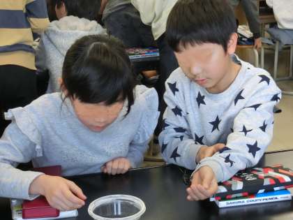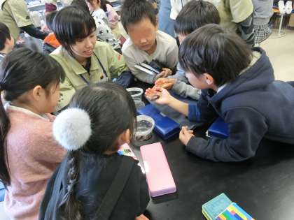 子どもたちは初めて見るマダガスカルゴキブリに大興奮。恐る恐る観察がはじまりました。7センチほどの大きい昆虫です。動作はゆっくり。特徴もたくさん見つけました。
