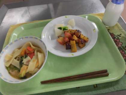 今日は12月22日の冬至にちなんだ献立です。冬至とは、1年間の中で最も昼が短く、夜が長い日のことです。湯治にゆず湯に入り、かぼちゃを冬至に食べるとかぜをひかないといわれています。また冬至にゆず湯に入る習慣は、「冬至」と「湯治(湯に入って体を治すこと)」という言葉をかけて生まれたといわれます。