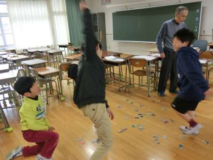 だるまおとし・めんこ・あやとりグループの様子です。だるまおとしは仲よく友達とかかわりながら遊びました。メンコは思いもよらずに激しいアクション、体いっぱい使って遊びました。あやとりは難しい技にも挑戦しました。6年生がやさしく見守りました。