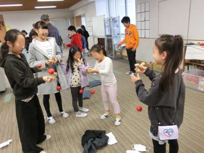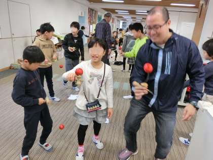 自分の技を高める楽しさがある「けんだま」遊びですが、自然と友達の輪ができ、仲間と一緒に挑戦する楽しさを子どもたちが味わっているのだと感じました。先生も子どもたちと一緒に挑戦です。