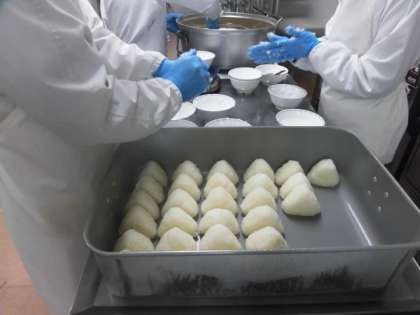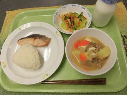 1月24日から30日は「全国学校給食週間」です。そこで、今日の給食は学校給食の歴史を伝えるために、日本の給食の始まりとされる明治22年に山形県の小学校で出されたものを再現してみました。その当時はおにぎりと焼き魚、漬け物だけの質素なものでしたが、子どもたちの栄養バランスを考え、牛乳や豚汁も足して提供しています。おにぎりの中身は何ですか?とか海苔が欲しかった!という子もいました。中には、鮭のほぐした身をおにぎりに詰めている子もいてそれぞれ工夫していました。恵まれた現代に生きる子どもたちは、食に対する想像力も豊かです。あらためて「おにぎり」の偉大さを感じました。そして、2時間近くおにぎりを握ってくれた調理員さんたちに感謝いたします。