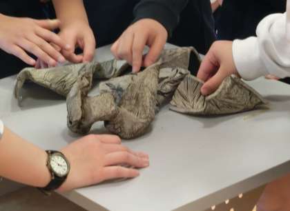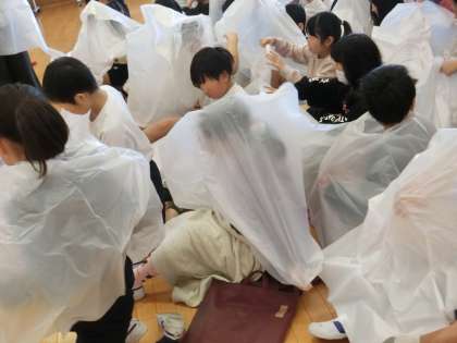 実際に手に触れながら、凍土花を鑑賞したのち、子どもたちに配られたのは白いビニルの袋です。この袋をかぶって、これから子どもたちが、見て、触れて、感じた凍土花を体いっぱい使って表現することになりました。このビニル・・・凍土花を表現するのにふさわしい素材を世田谷美術館の皆様が厳選し、そして、一人一人頭の部分をくり抜いて持参してくださいました。