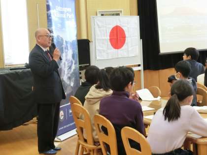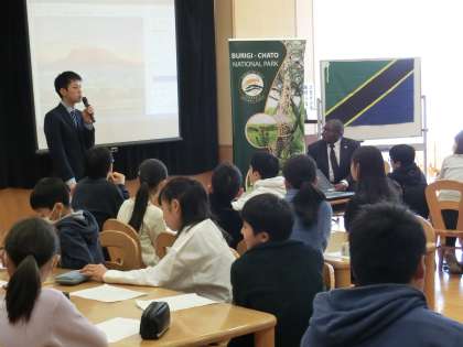 タンザニア大使館と6年生の交流授業の様子です。タンザニア大使館の皆様との交流は10年以上続く、駒沢小学校の特色の一つです。駒沢小学校同窓会の皆様が、小学校卒業を目前にした6年生に、国際社会に羽ばたいてほしいという願いから行われている取組です。今年も、タンザニア大使館から大使をお迎えすることができました。同窓会からごあいさついただいたのち、いよいよ授業のはじまりです。タンザニアを様々な角度からご紹介いただきました。6年生も真剣に聞いていました。